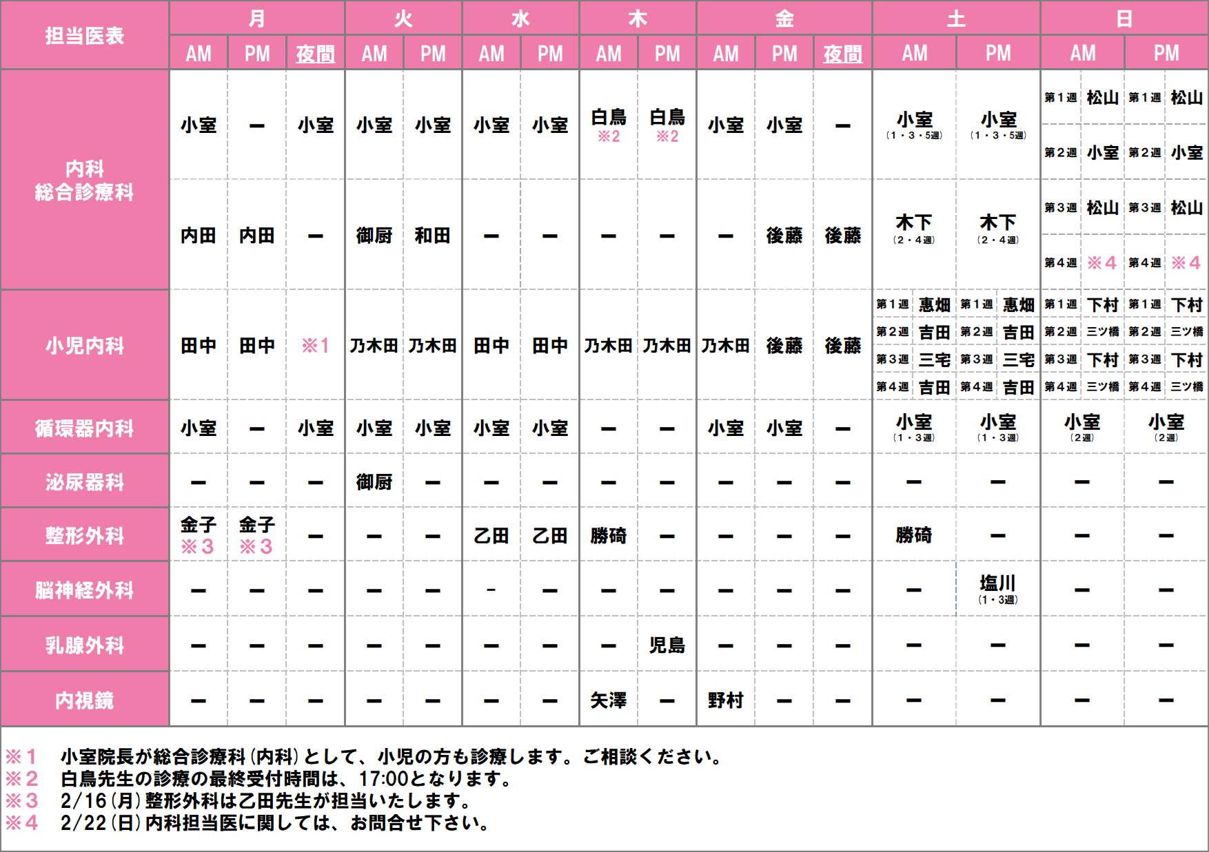 2026年2月の担当医のお知らせになります。