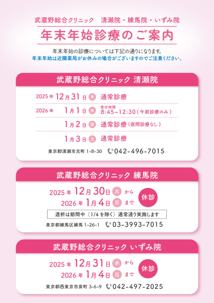 武蔵野総合クリニック いずみ院の年末年始は、下記の期間が休診となります。