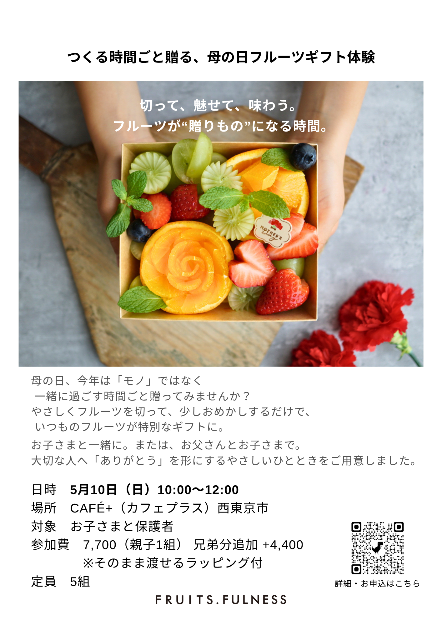 5月10日(日)にCafé+にて、フルーツビジュアルクリエイター・さちこ先生による親子ワークショップ「母の日フルーツギフト体験」が開催されます。